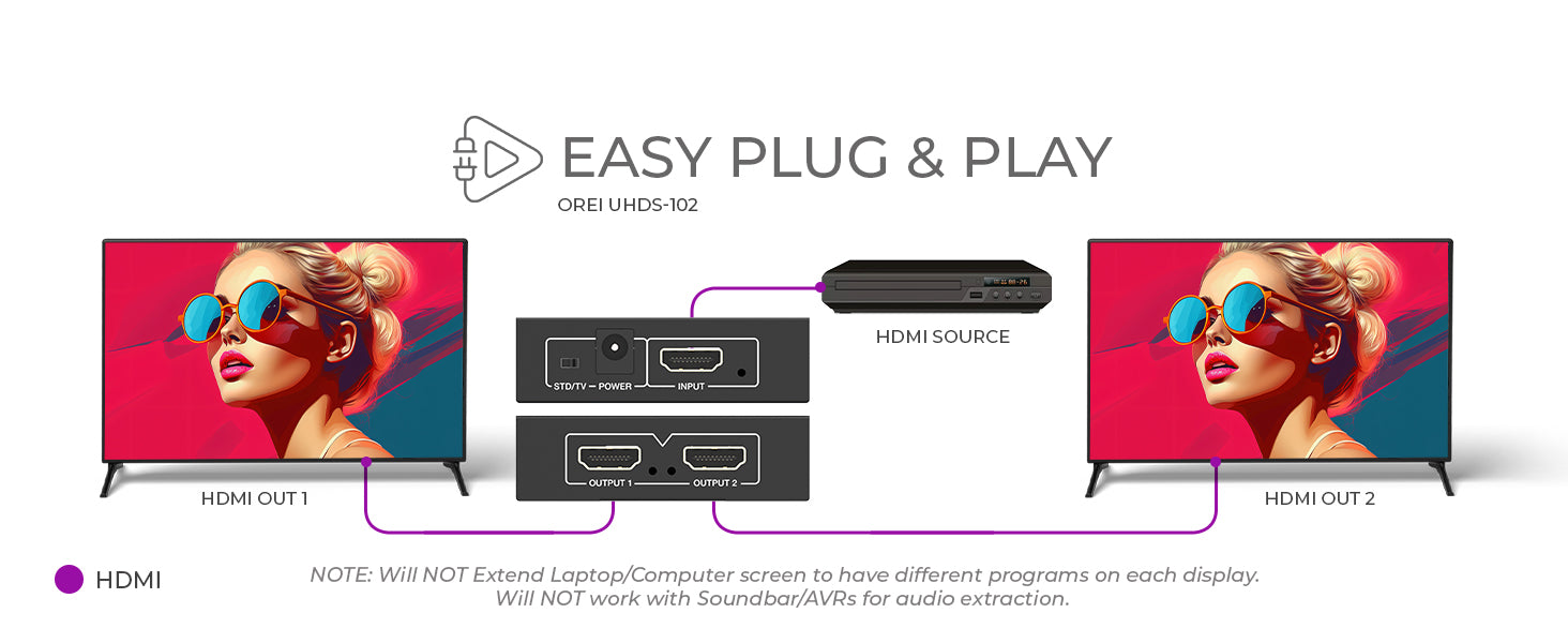 The UHDS-102 takes your viewing experience to the next level with HDR10+, Dolby Vision, and HLG support. These advanced features enhance color, contrast, and overall image quality, providing stunning visuals on both connected screens. Whether you're using it as a display splitter HDMI for gaming or enjoying the latest movie, the superior contrast and rich colors make for a truly immersive experience.