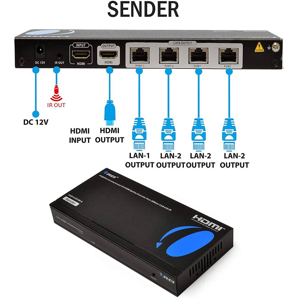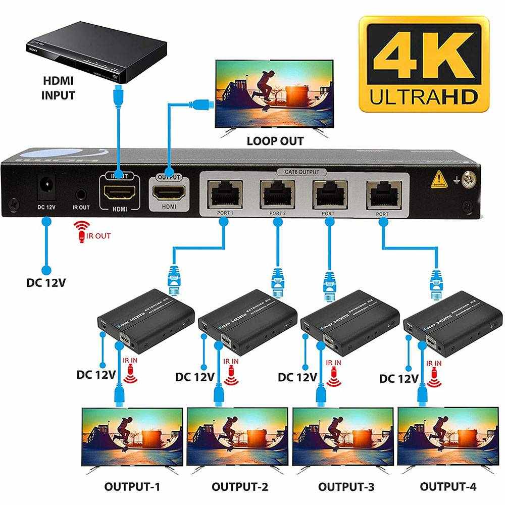 - Distribute 1 HDMI source to 4 HDMI displays over LAN CAT6/7 network cable simultaneously