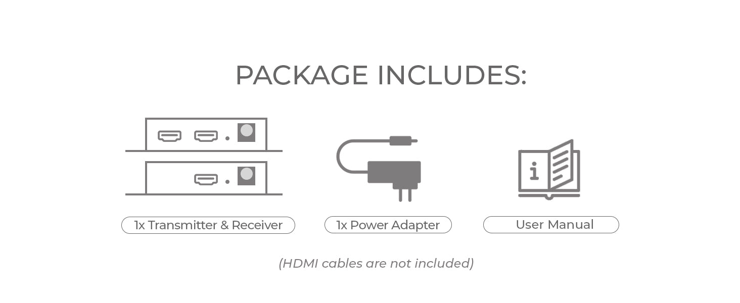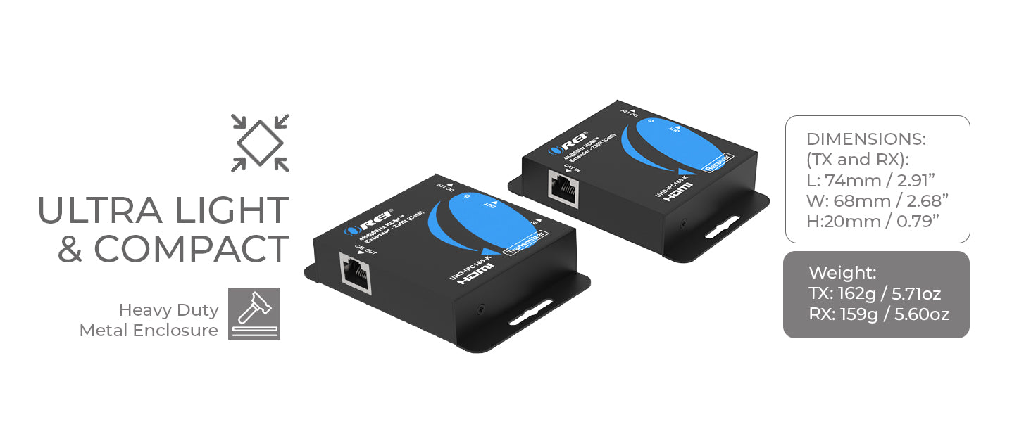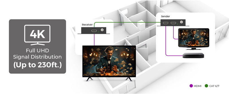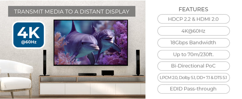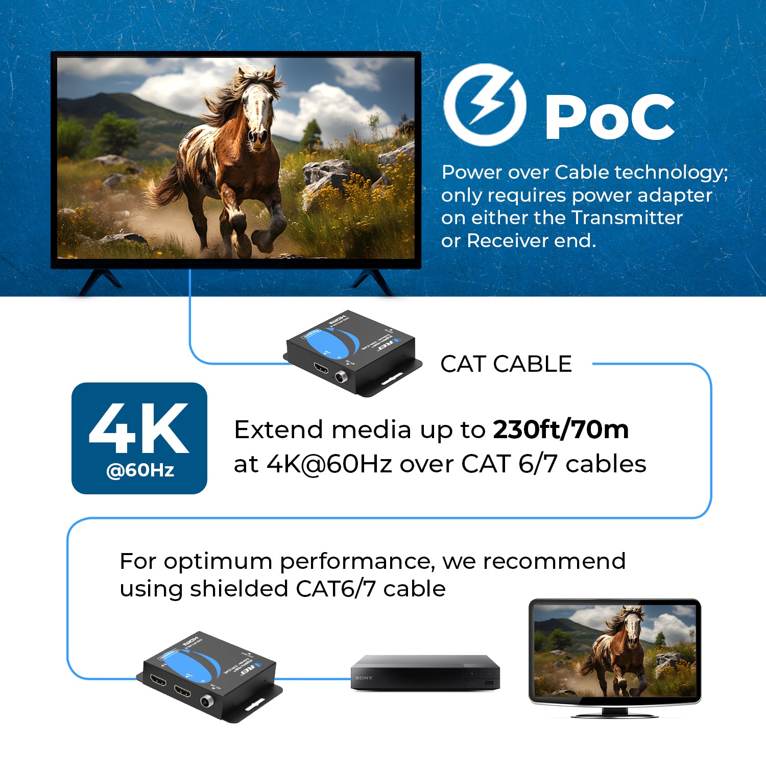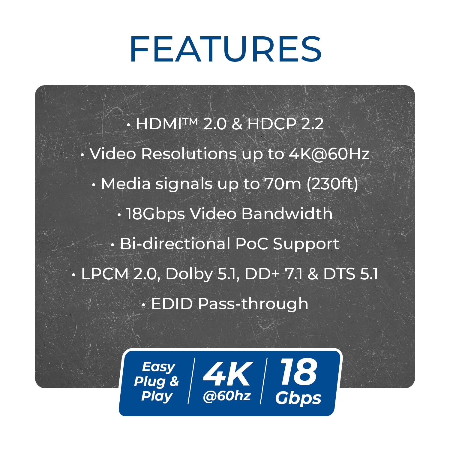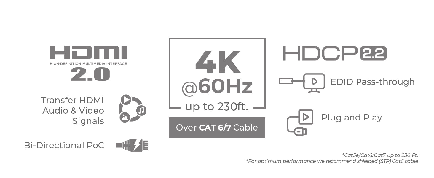 • Transmission up to 230 ft (70 m) – Extends HDMI up to 165 ft (50 m) at 4K@60Hz and up to 230 ft with shielded CAT6/6a/7 cables.