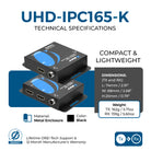 The UHD-IPC165-K includes L/R audio extraction at the receiver for direct connection to external audio systems. HDR10 passthrough ensures accurate color and dynamic range reproduction across compatible displays. The built-in uni-directional IR pass-through allows users to control the source device from the remote location, supporting streamlined system operation.