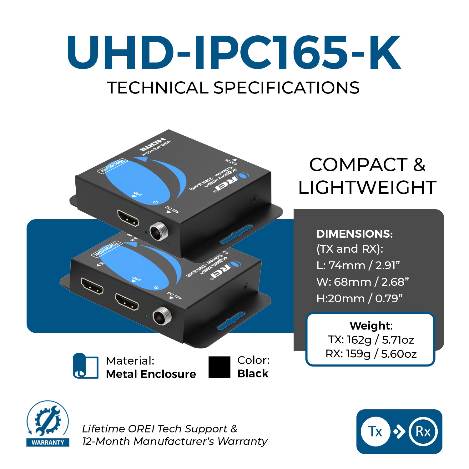 With EDID copy and auto-downscaling, the extender optimizes signal compatibility across different display types. Its compact design and plug-and-play functionality enable fast deployment without special configuration. Engineered for dependable performance, the UHD-IPC165-K is well-suited for classrooms, meeting rooms, retail displays, and general long-distance HDMI extension needs