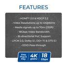 This extender supports HDMI transmission up to 165 ft (50 m) at 4K@60Hz and up to 230 ft (70 m) at lower resolutions when using shielded CAT6/6a/7 cables. Its 18Gbps bandwidth enables full-quality audio and video without compression artifacts. An integrated HDMI loop output allows a local display connection at the transmitter, making it convenient for monitoring or dual-screen setups.