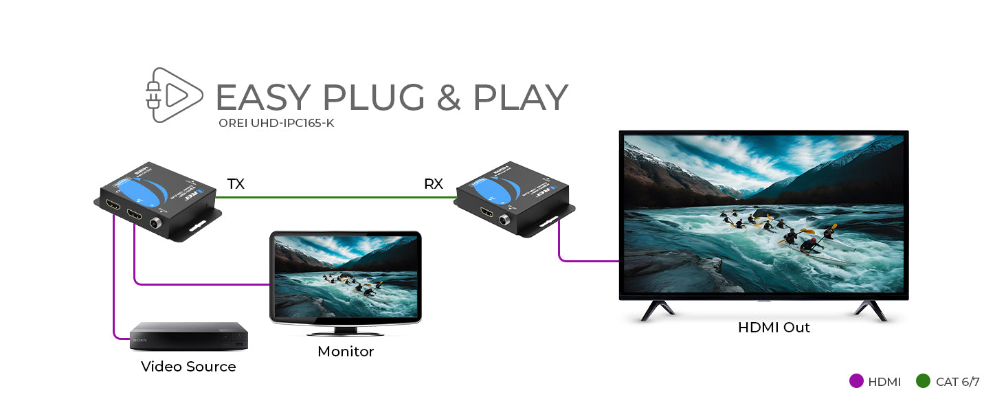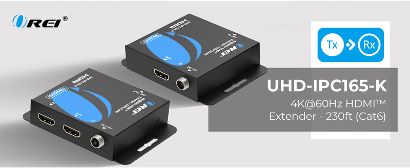 The OREI UHD-IPC165-K extends uncompressed 4K@60Hz HDMI signals using a single CAT6/6a/7 cable, ensuring reliable performance for residential and commercial AV applications. With full HDMI 2.0 and HDCP 2.2 compliance, it maintains proper compatibility with modern source devices, displays, and protected content formats. The system delivers stable, high-quality video suitable for control rooms, conference environments, and home installations.