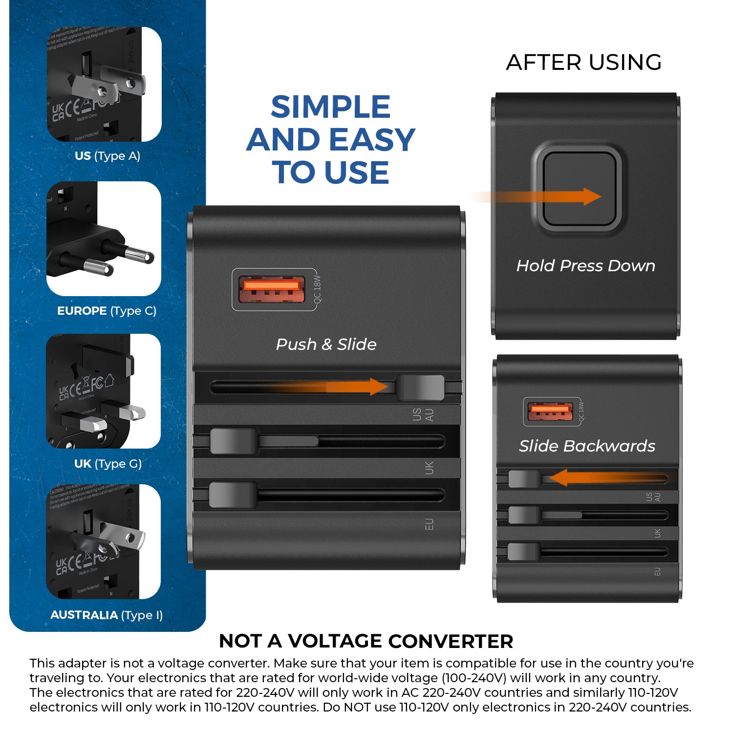 OREI 25W Universal Travel Adapter | 4-in-1 Fast Charger for 150+ Countries | USB-C & USB-A