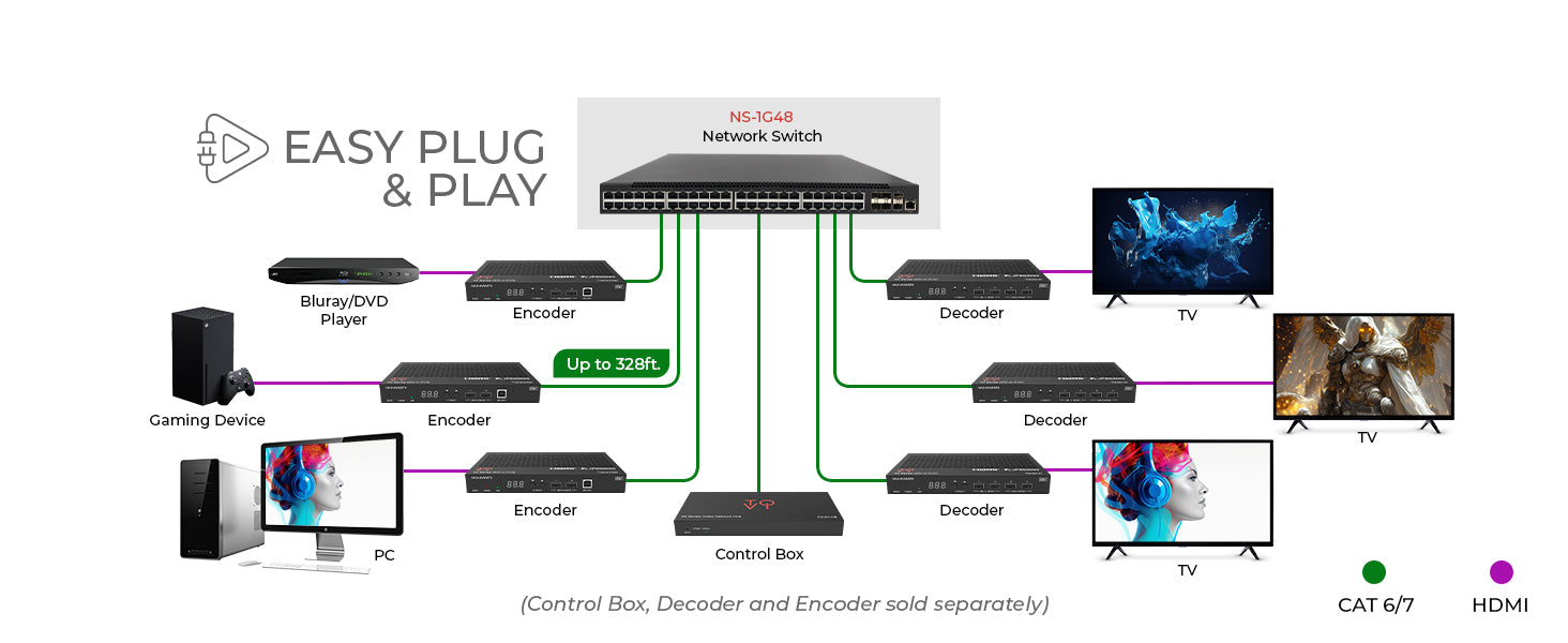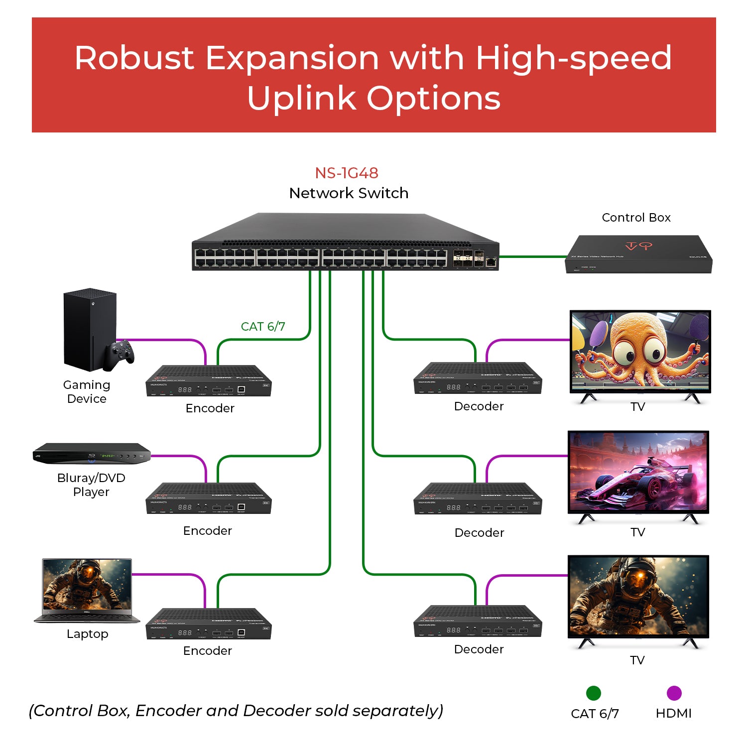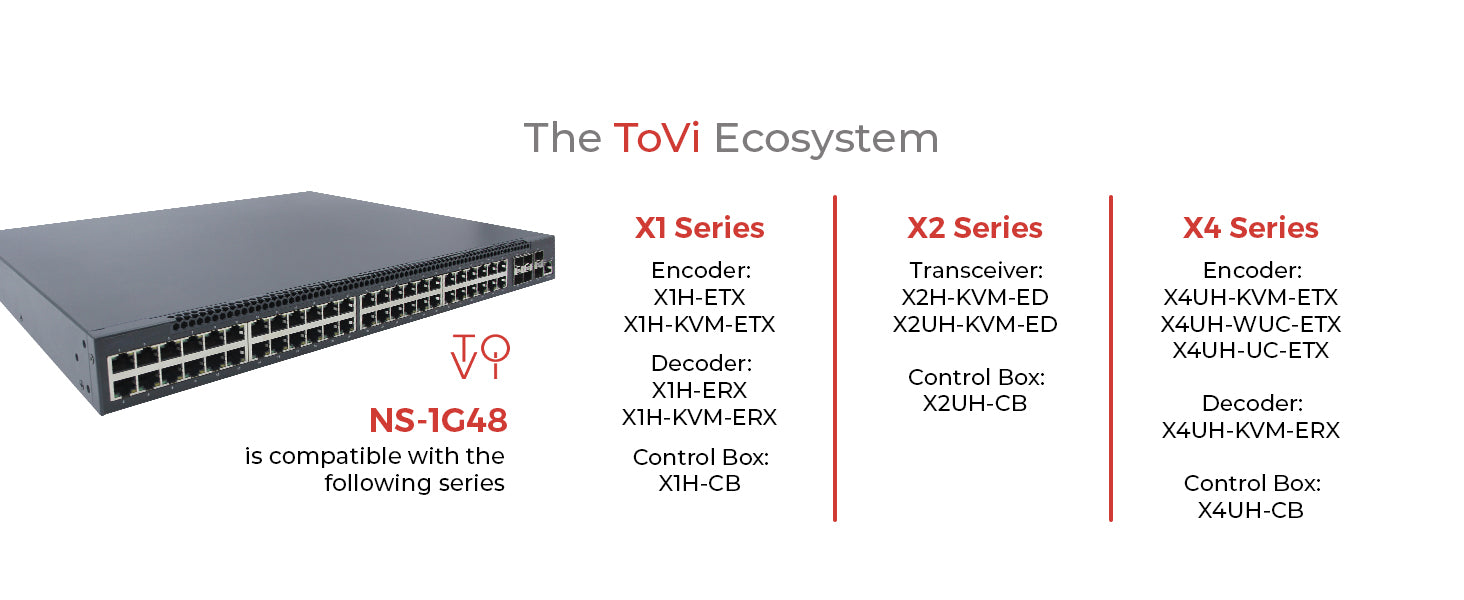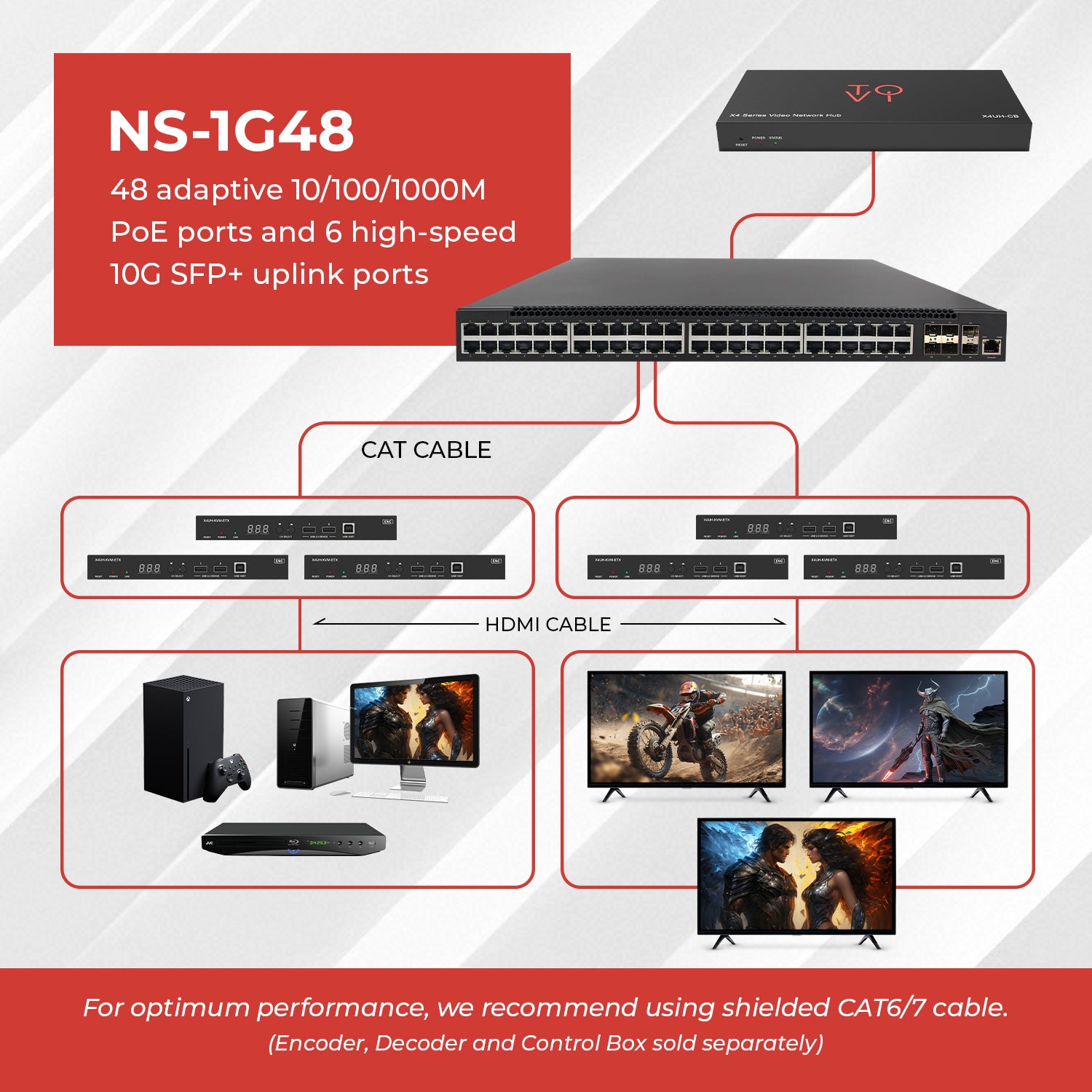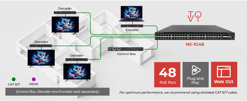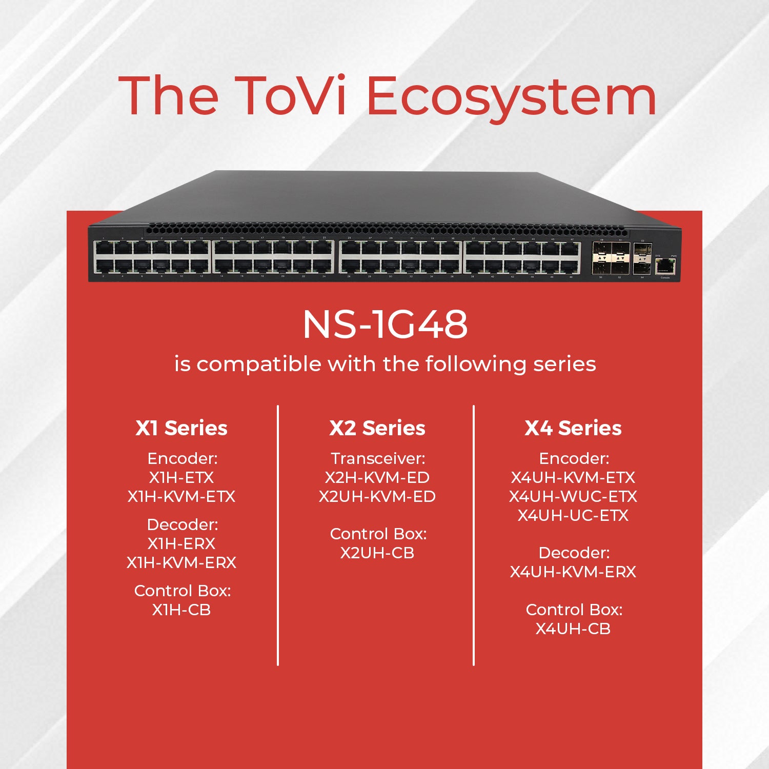 With plug-and-play setup for quick installation and a web-based management interface for centralized control, the NS-1G48 makes network configuration simple and intuitive. It also supports PoE for powering devices like IP cameras and AV-over-IP transmitters directly through the network. Fully compatible with ToVi’s X1, X2, and X4 series, it ensures smooth, reliable integration for unified and scalable system performance.