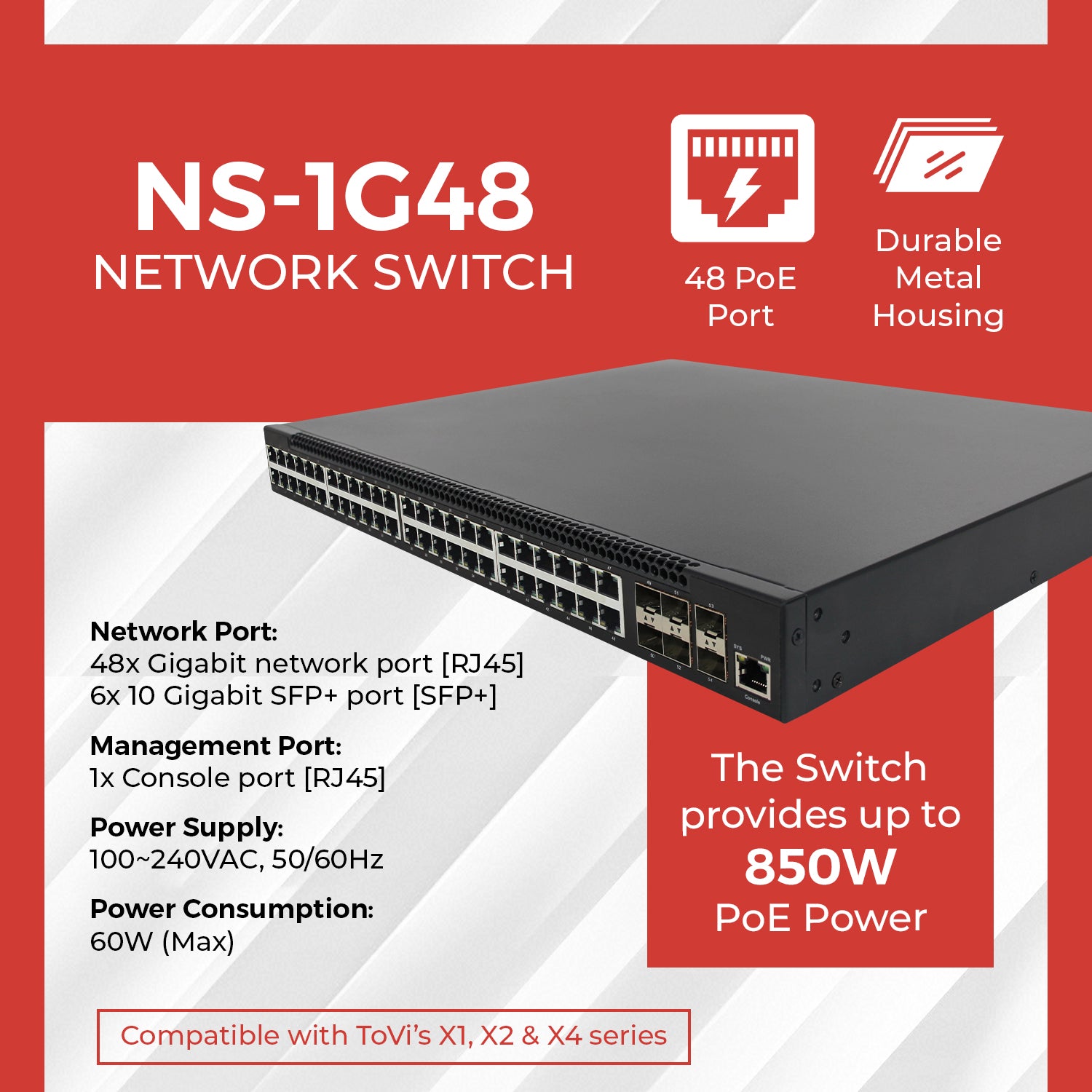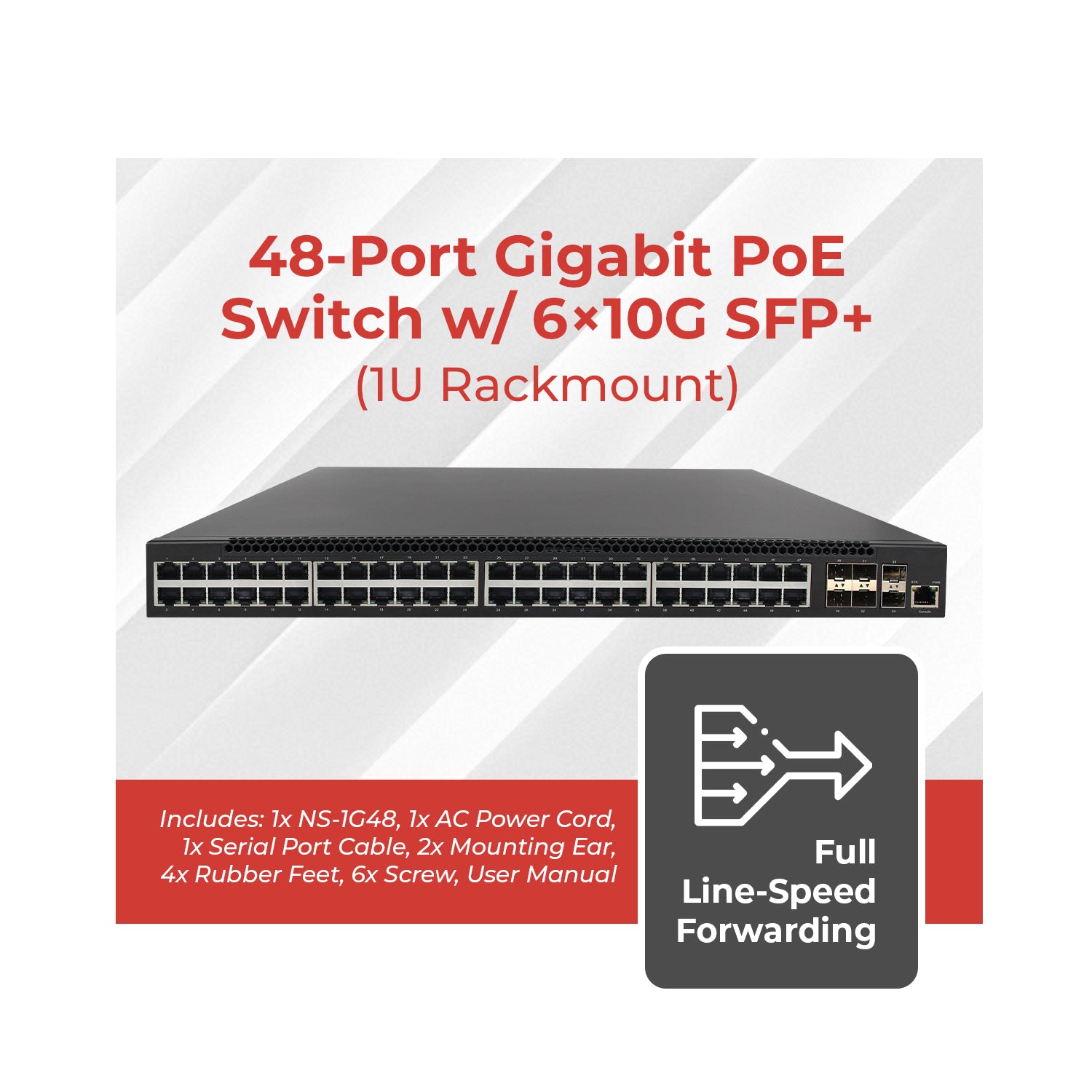 ToVi 48-Port Gigabit PoE Switch w/ 6×10G SFP+ Uplink (1U Rackmount) - (NS-1G48)