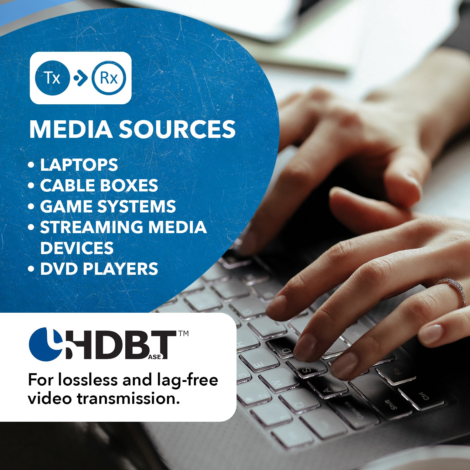 - HDBaseT Technology – Provides zero-latency, lossless video and audio transmission over shielded CAT5e/6 LAN cables. Supports Power Over Ethernet (PoE), requiring only a single power adapter at the transmitter end.