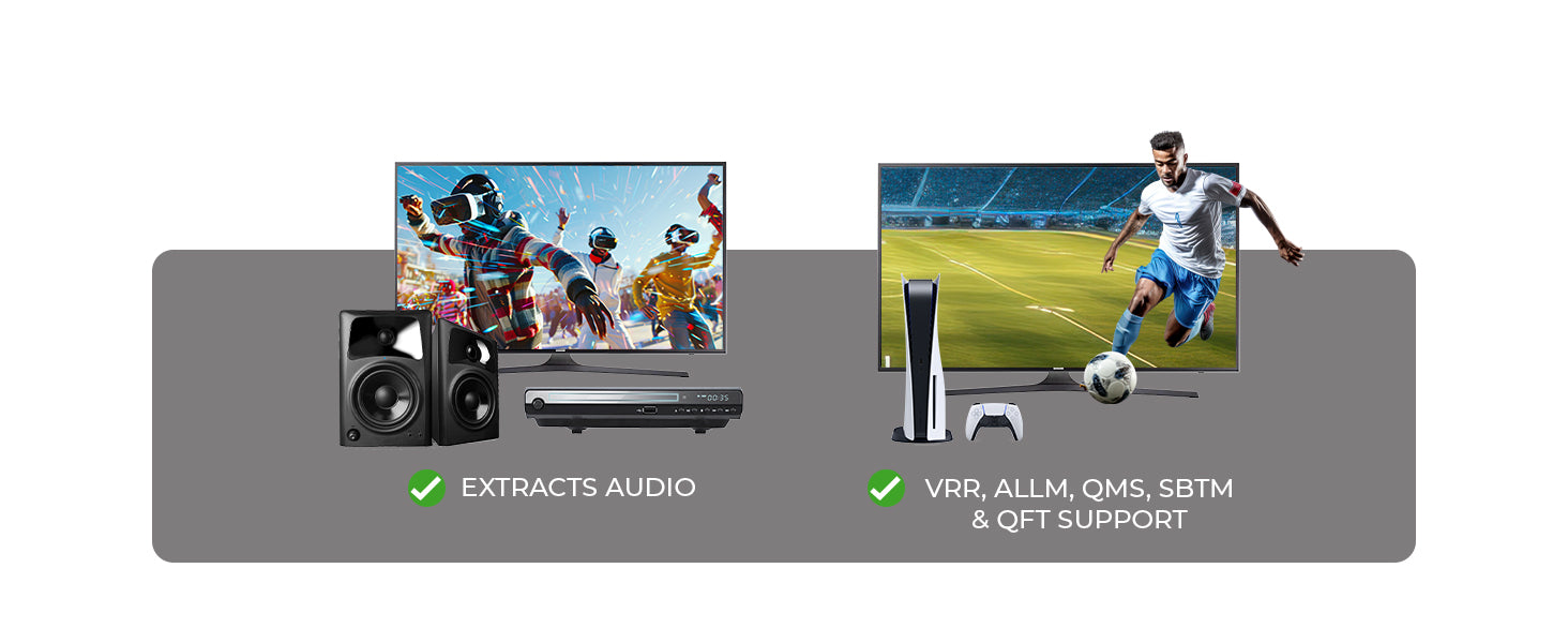 Unlock the full potential of your setup with support for VRR, ALLM, QMS, QFT, and SBTM. Whether you're gaming or streaming, this HDMI audio extractor delivers smooth motion, low latency, and rich visuals thanks to HDR10, HDR10+, Dolby Vision, and HLG pass-through.