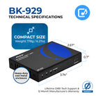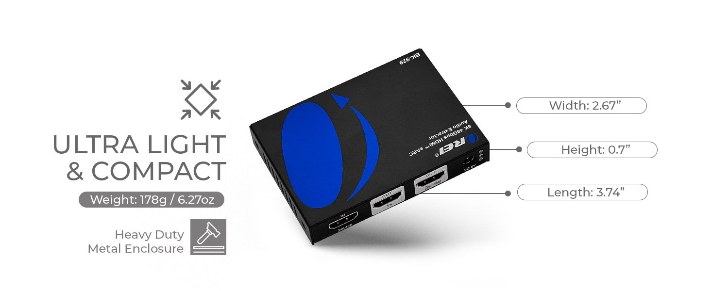 The BK-929 is a high-performance HDMI 2.1 audio extractor designed to deliver immersive audio from any HDMI input source to ARC/eARC-enabled soundbars or AV receivers. It supports advanced video resolutions up to 8K@60Hz and 4K@120Hz, with full compliance to HDMI 2.1 and HDCP 2.3 standards.