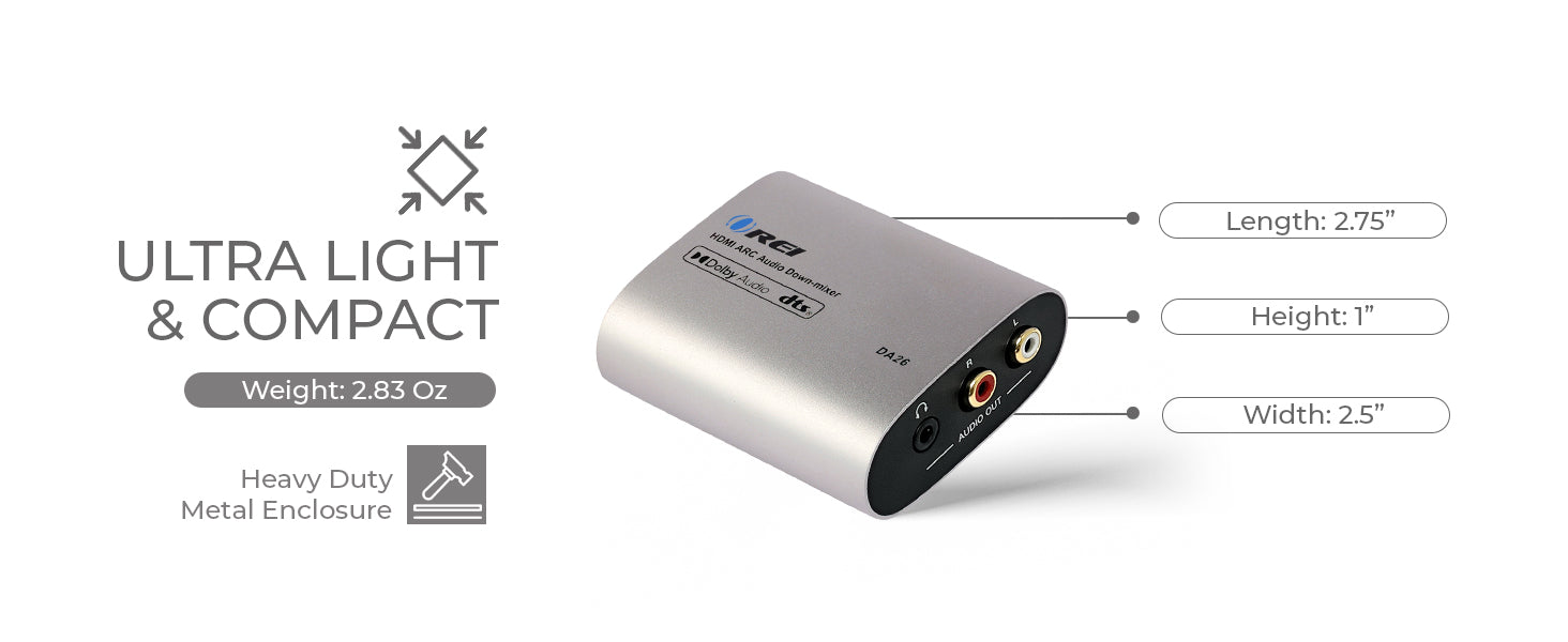 The DA26 HDMI ARC Audio Down-Mixer is a compact yet powerful audio solution that allows users to extract and convert digital audio from an ARC-enabled HDTV into 2-channel analog stereo output. Perfect for integrating modern TVs with older amplifiers, sound systems, or headphones, the DA26 supports PCM 2.0, Dolby 5.1, and DTS 5.1 audio formats, with real-time down-mixing to analog L/R or 3.5mm output.