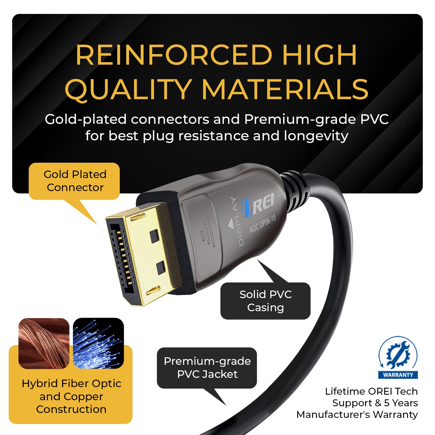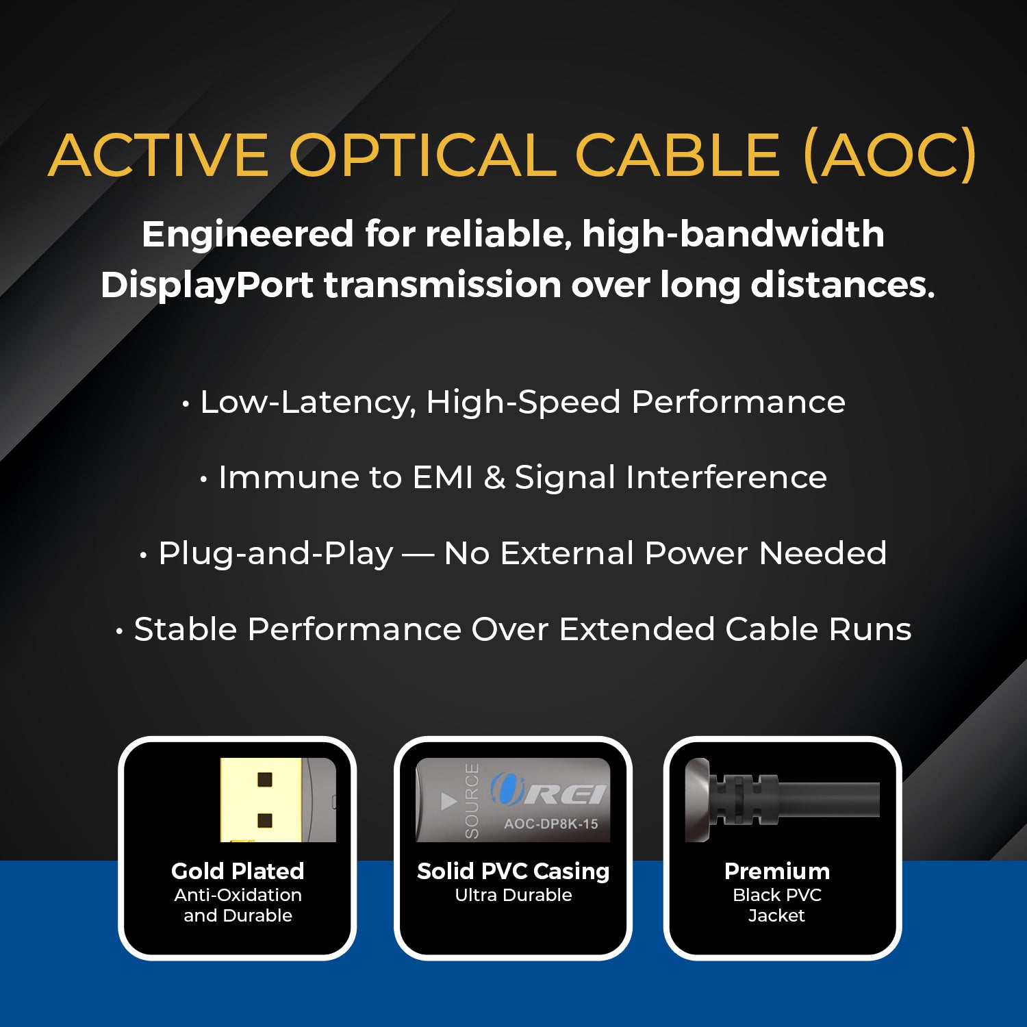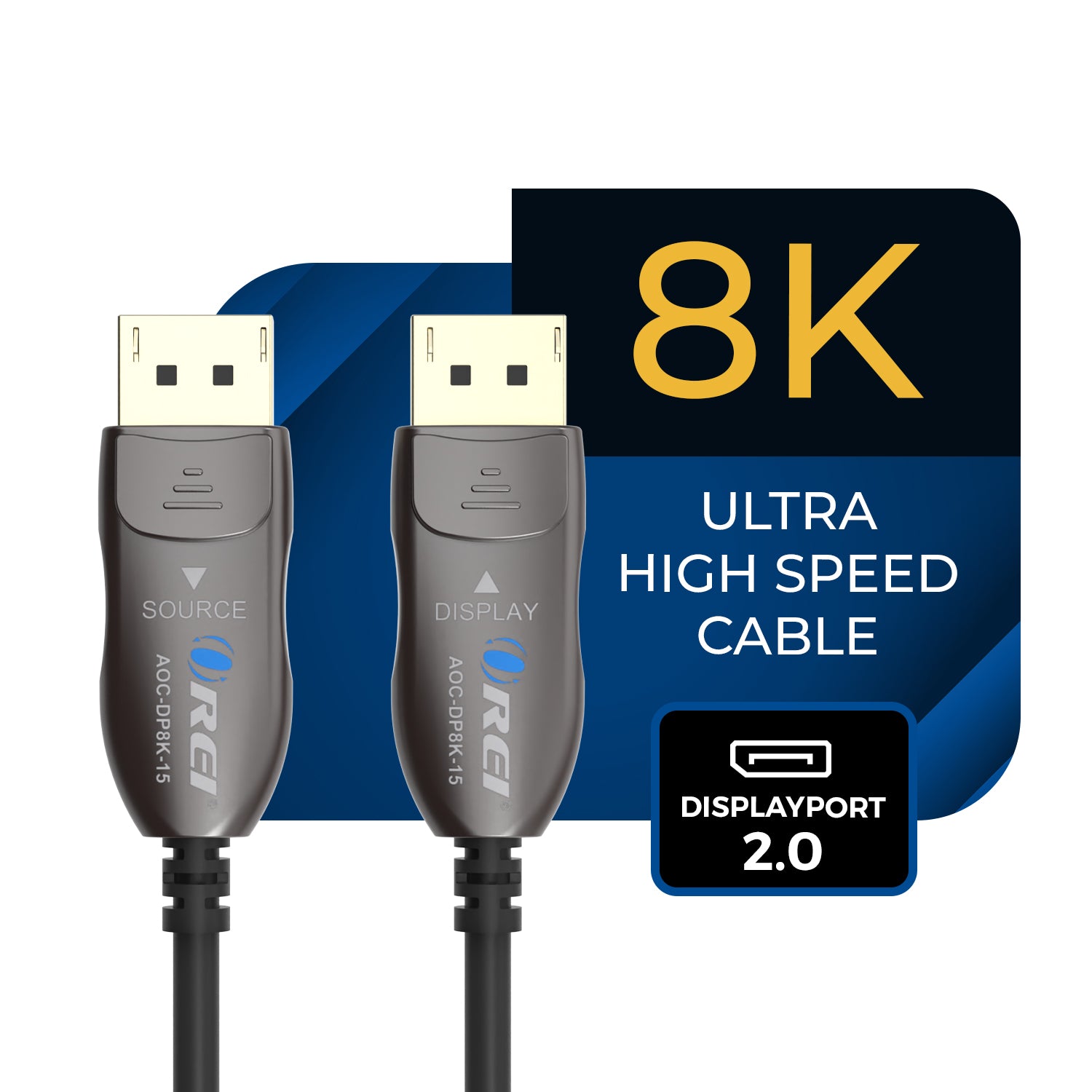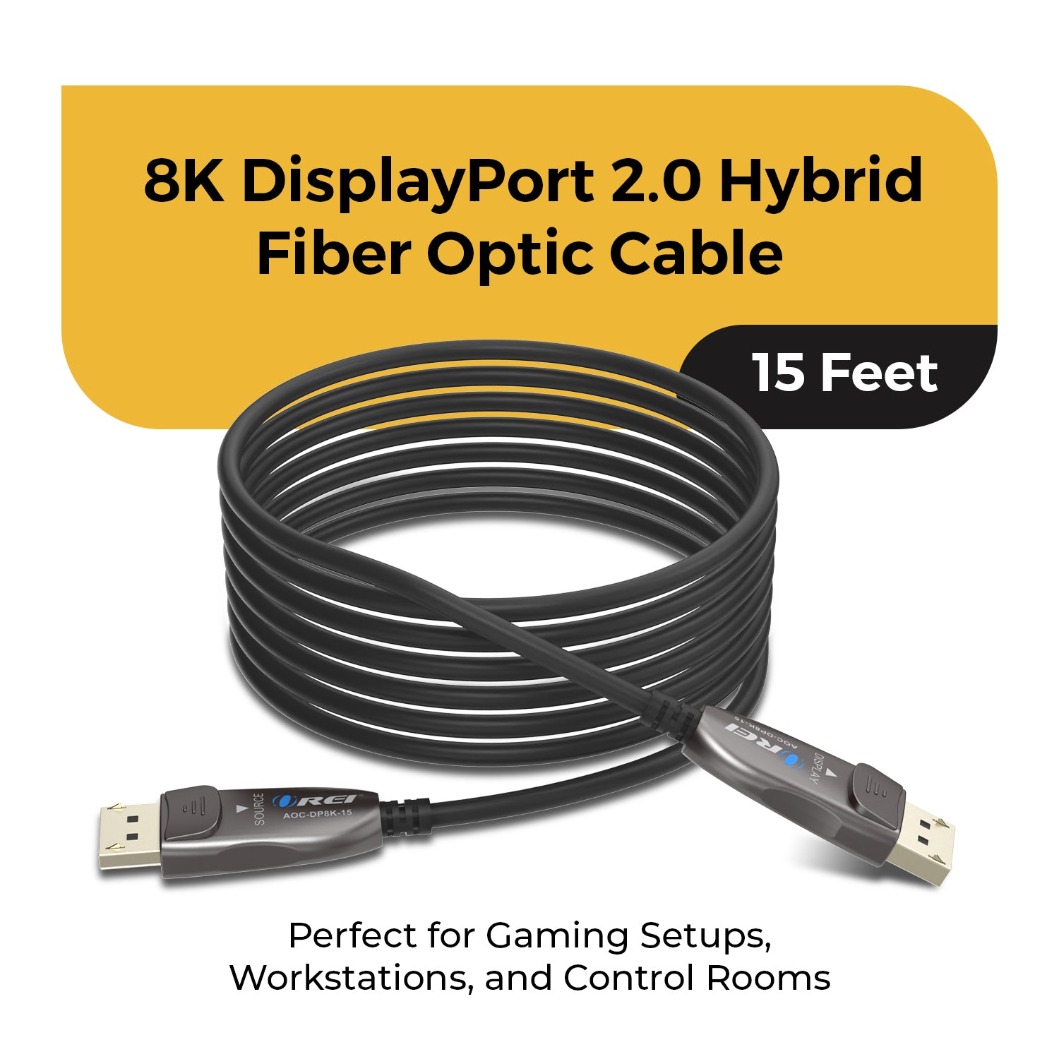The OREI AOC-DP8K-15 DisplayPort 2.0 Active Optical Cable delivers uncompromised high-bandwidth performance for advanced gaming, professional workstations, and premium AV setups. Using hybrid active optical fiber technology, it transmits uncompressed video and audio up to 54Gbps with zero latency, signal degradation, or electromagnetic interference.