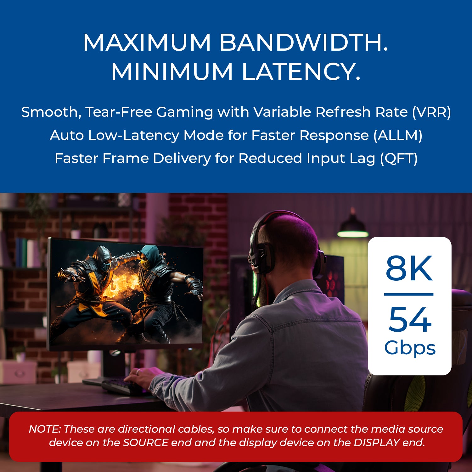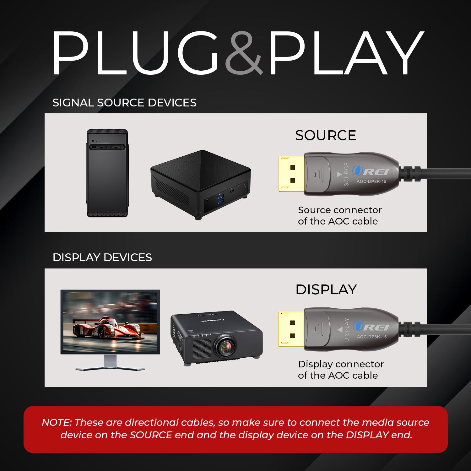 Built with a hybrid copper and fiber optic construction, the AOC-8K-300 eliminates interference while remaining flexible and lightweight. Gold-plated connectors and a nylon-braided PVC jacket ensure long-lasting durability, while the directional design with clearly labeled source and display ends guarantees proper installation every time.