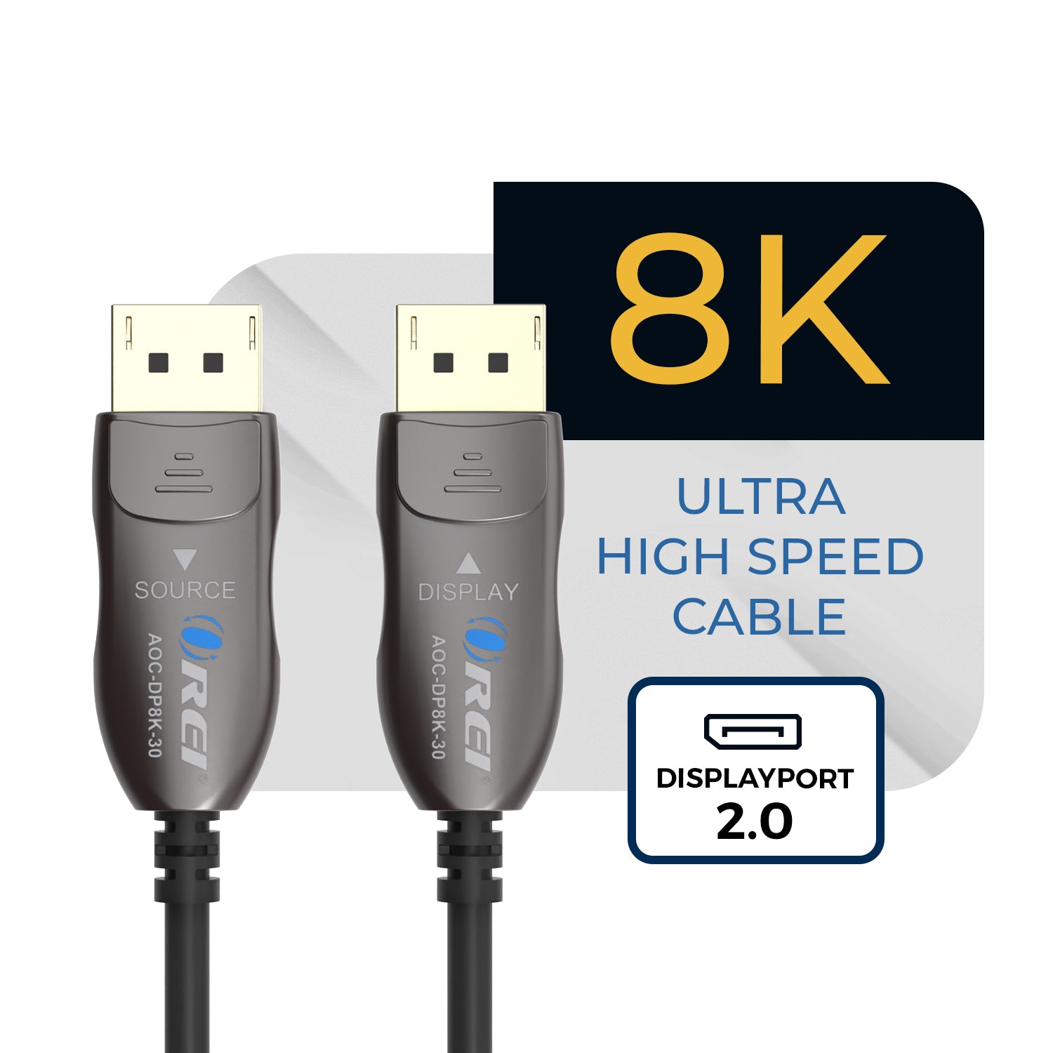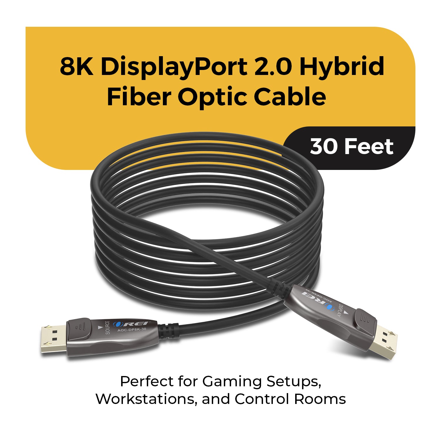 The OREI AOC-DP8K 30ft DisplayPort 2.0 Active Optical Cable is built for high-bandwidth, long-distance signal transmission without compromise. Its hybrid copper-fiber AOC design delivers a full 54Gbps of uncompressed video and audio with zero signal loss, latency, or electromagnetic interference—making it ideal for extended gaming, workstation, and professional AV setups.