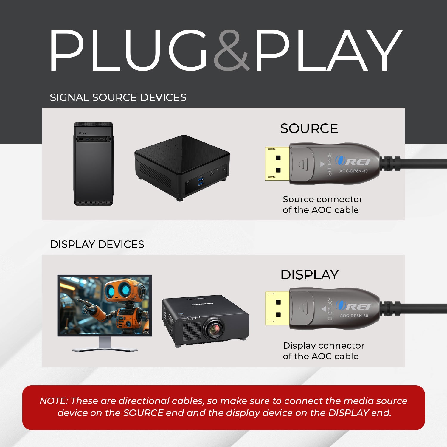 Built with a hybrid copper and fiber optic construction, the AOC-8K-300 eliminates interference while remaining flexible and lightweight. Gold-plated connectors and a nylon-braided PVC jacket ensure long-lasting durability, while the directional design with clearly labeled source and display ends guarantees proper installation every time.