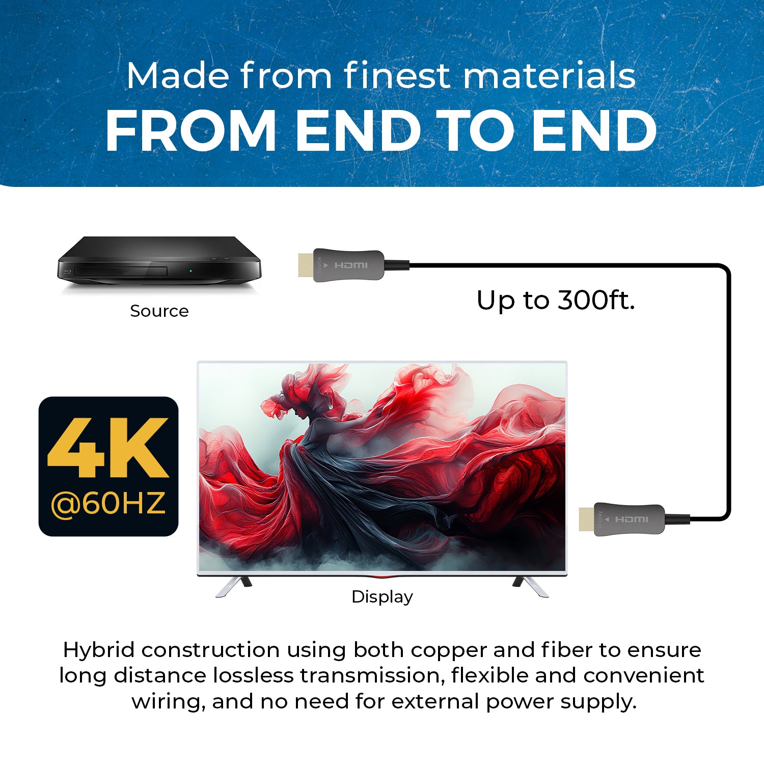 With a hybrid design combining copper and optical fiber, the cable eliminates electromagnetic interference, delivering stable, uncompressed video and audio signals up to 300 feet (~91.5 meters).