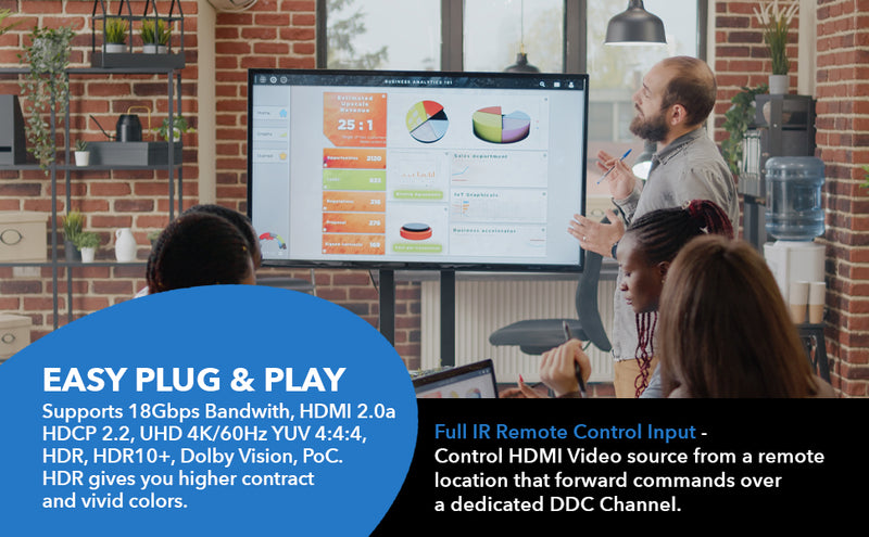 Enjoy sharp, vibrant visuals with support for full 4K@60Hz (4:4:4) resolutions and advanced HDR formats including HDR10+ and Dolby Vision. With 18Gbps bandwidth, this HDMI extender splitter delivers uncompressed UHD video and multi-channel audio for a premium viewing experience across all connected displays.