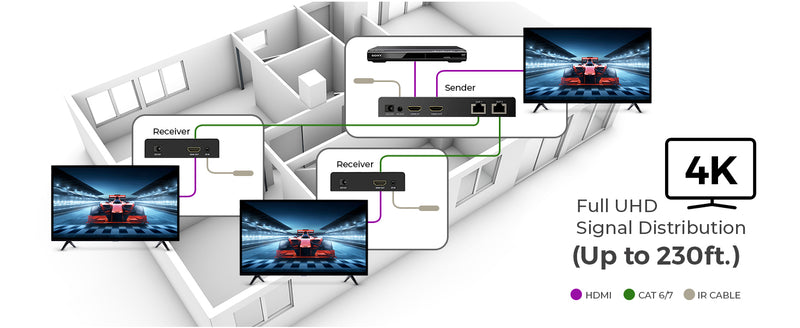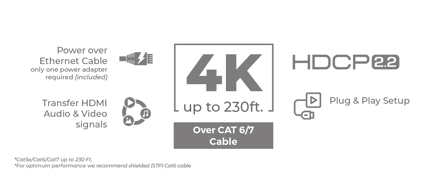 - Long-Distance Extension – Extend media up to 230 ft (70 m) at 4K@60Hz over CAT6/7 cables.