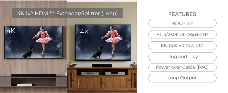 4K@60Hz 1x2 HDMI™ Extender Splitter (Loop) - 230ft (Cat6) (UHD12-EX230-K)
