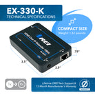 The EX-330-K HDMI over IP Extender is a reliable AV distribution solution designed to extend and distribute full HD 1080p signals over long distances using standard network infrastructure. Utilizing H.265 compression and HDMI 1.3 compatibility, it supports resolutions up to 1920×1080@60Hz with signal transmission up to 492 feet (150 meters) via a single CAT5e/6 cable.