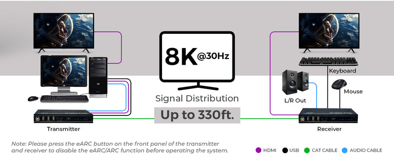 The extender includes eARC/ARC functionality, making it easy to route high-definition audio back from a display to an AV receiver. With VRR, ALLM, and FVA compatibility, it's also optimized for next-gen gaming setups. Additionally, USB 2.0 KVM extension provides full remote control capability, ideal for managing PCs or media systems from a distance.