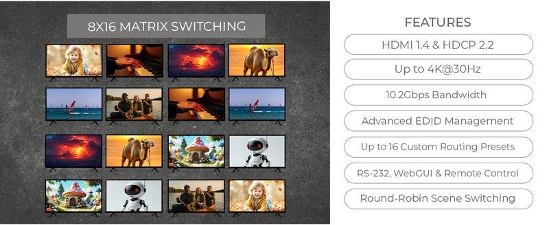 Advanced EDID management offers optimal device compatibility, and the system allows users to save and recall up to 16 custom switching scenes. The round-robin switching function automates scene cycling at defined intervals.