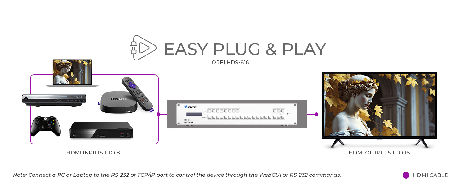 - Flexible Control Options – Operate via front panel buttons, IR remote, RS232 commands, or intuitive WebGUI.