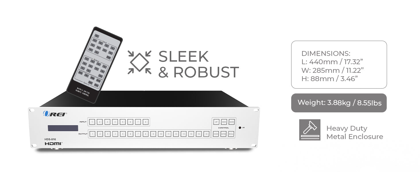 Easily operate the system using front panel buttons, the included IR remote, RS-232 commands, or a user-friendly WebGUI. Designed for commercial AV use, the 2U rack-mount chassis ensures the HDS-816 integrates seamlessly into professional equipment racks, making it one of the best HDMI matrix options for demanding installations.