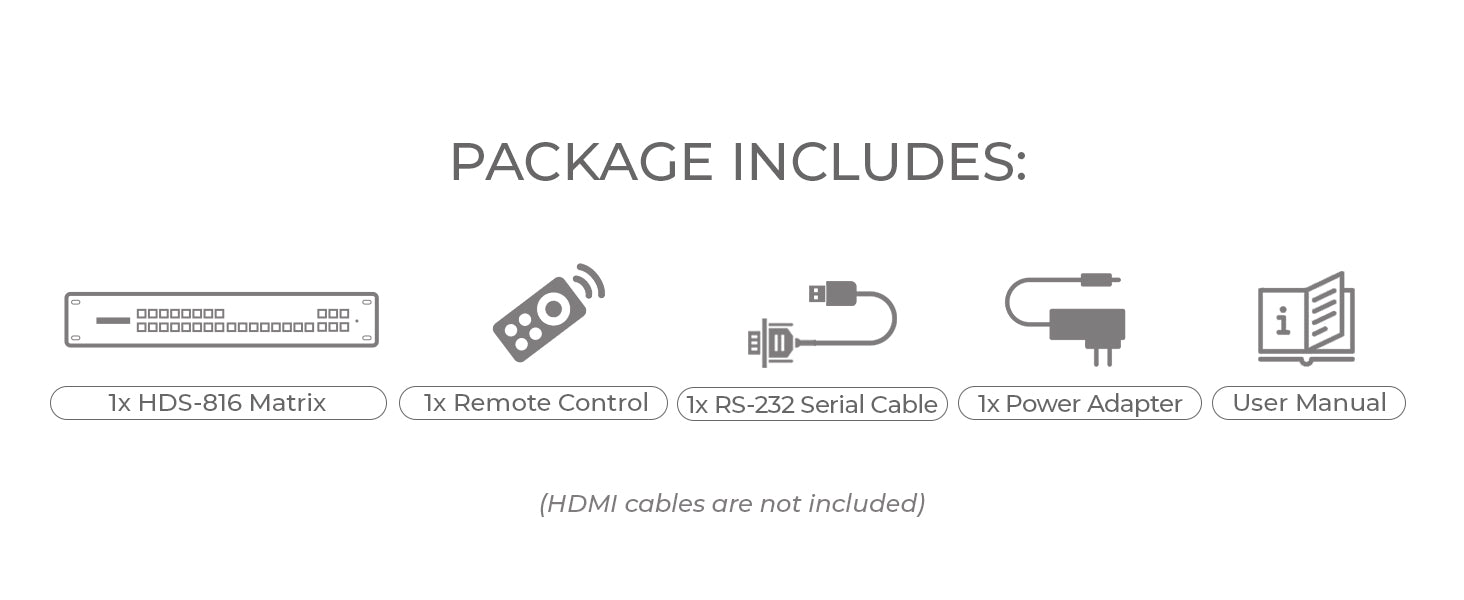 The HDS-816 is a professional-grade 8x16 HDMI™ Matrix Switch designed for flexible signal routing in commercial AV environments. It enables seamless switching between 8 HDMI™ sources across 16 HDMI™ displays, making it ideal for video walls, digital signage, control rooms, and large-scale presentation systems.