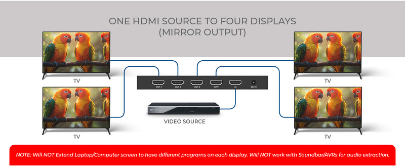 This HDMI splitter 1x4 allows you to distribute a single HDMI source to up to four displays, all while maintaining clear, high-definition 4K video at 60Hz. Whether you're connecting it as an HDMI port splitter for TV or using it as a laptop screen splitter, it guarantees that each display gets the same ultra-HD content without any degradation in quality. With 18Gbps of video bandwidth, it ensures a smooth, stable connection across all outputs.