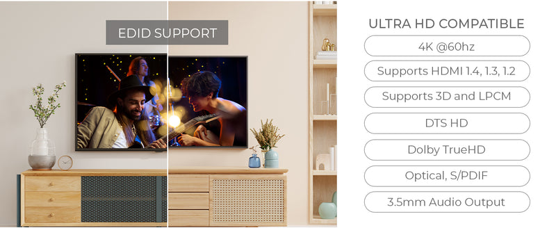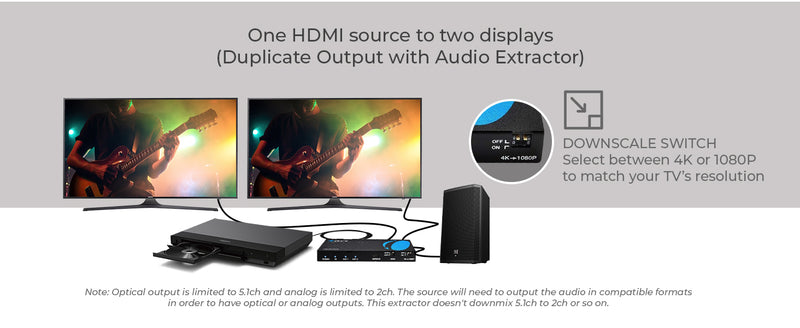 • Audio Extraction – Outputs audio through Optical and 3.5mm stereo ports for flexible connectivity.