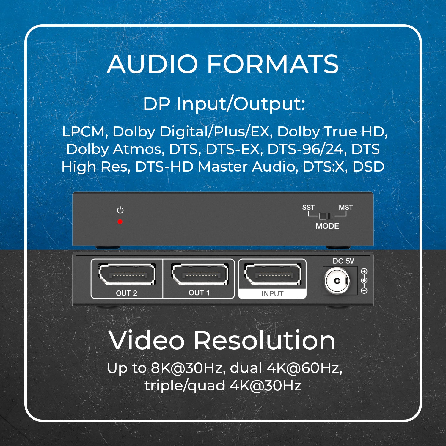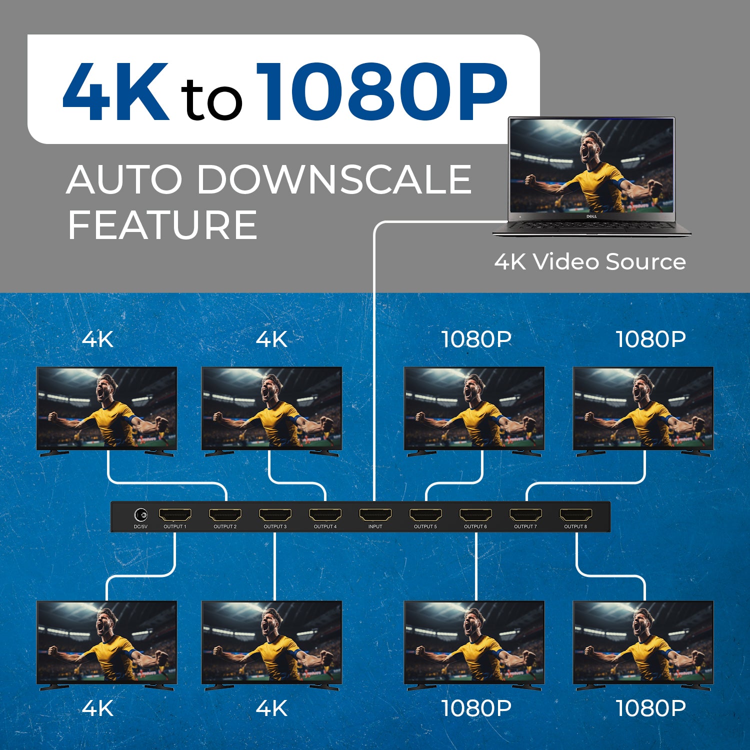 - 1 in 8 out – ideal for larger venues or digital signage