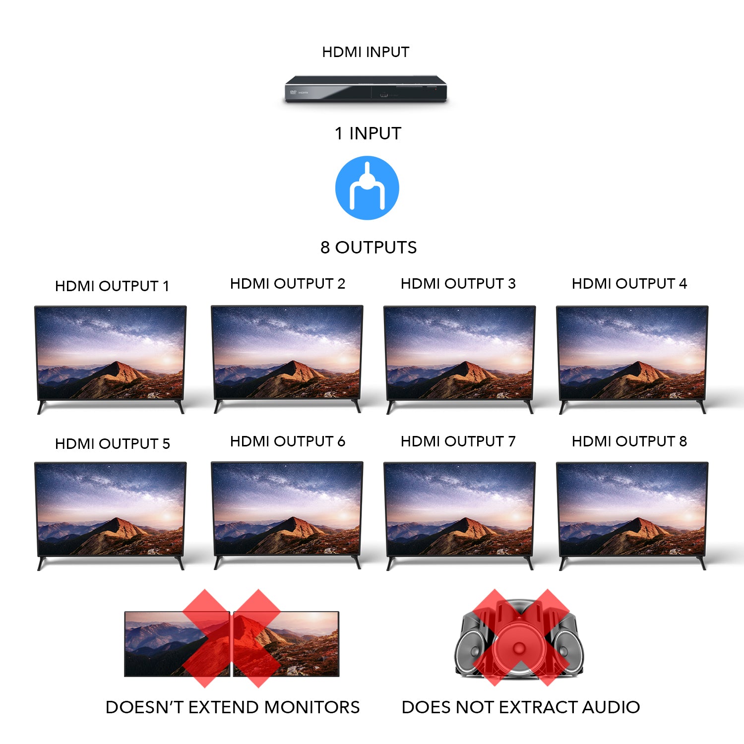 Our HDMI splitters are compatible with all HDMI-enabled equipment, including Blu-ray/DVD players, gaming consoles, satellite boxes, streaming devices, and projectors. Please note: splitters will duplicate the screen on all outputs—they will not extend or create separate displays.