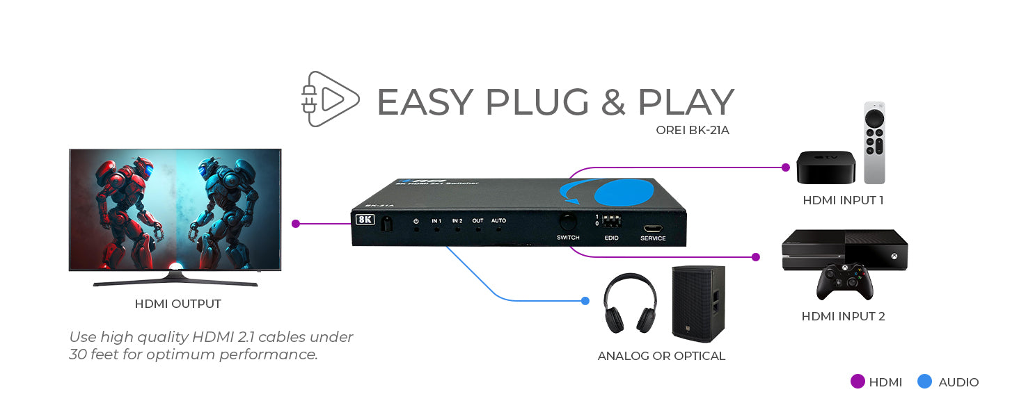With EDID management, automatic source switching, front panel buttons, and a remote control, it offers complete control and ease of use. Perfect for gaming consoles, streaming devices, and home entertainment systems, the BK-21A is a future-ready solution for 8K displays.