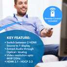 Enjoy premium video features like HDR10+ and Dolby Vision, delivering brilliant contrast, color depth, and dynamic range. For audio, the BK-21A supports advanced formats including Dolby TrueHD, DTS-HD Master Audio, LPCM, and DSD. With built-in optical and 3.5mm analog outputs, this audio extractor switch ensures full audio flexibility across any sound system setup.