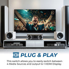 - Connect 4 HDMI™ Sources to 1 Output – Easily switch between four devices on a single 8K or 4K display.