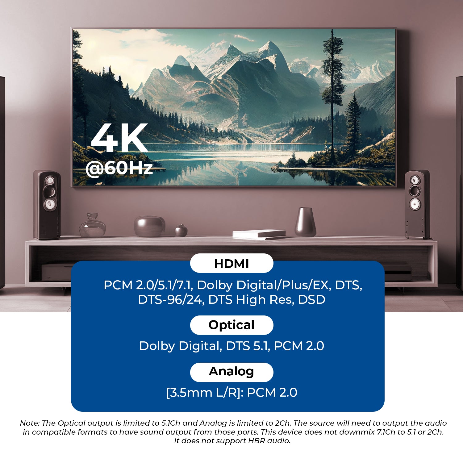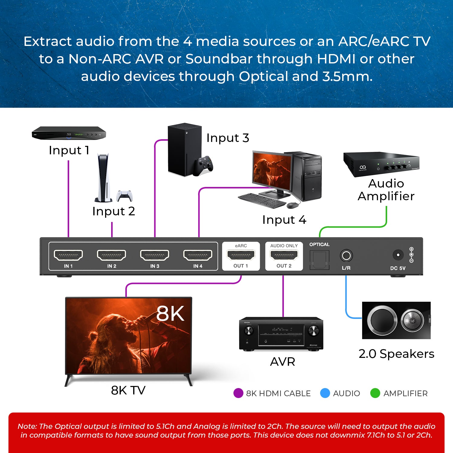 The HDMI Switcher supports ARC function and seamless switching. It also has optical output so you can connect soundbar, home theater system, or AV Receiver.