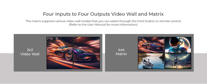 The UHDS-404VW offers dual functionality as both a 4x4 matrix video wall controller and a seamless video wall processor. Easily switch between sources or configure output modes like 2×2, 4×1, or 1×4 to suit any environment—from conference rooms to digital signage networks. Its ability to function as a high-performance HDMI video wall or a dynamic matrix switcher makes it one of the most versatile tools in any AV setup.