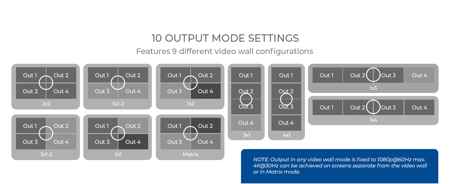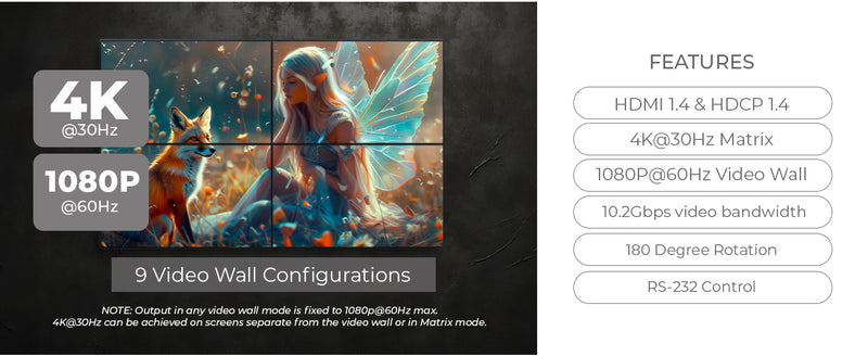 Video Output Resolutions up to 4K@30Hz (Matrix) & 1080p@60Hz (Video Wall) – Provides clear visuals for both standard and large-scale display setups.