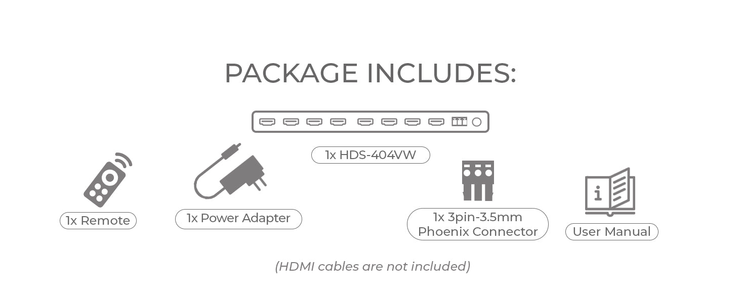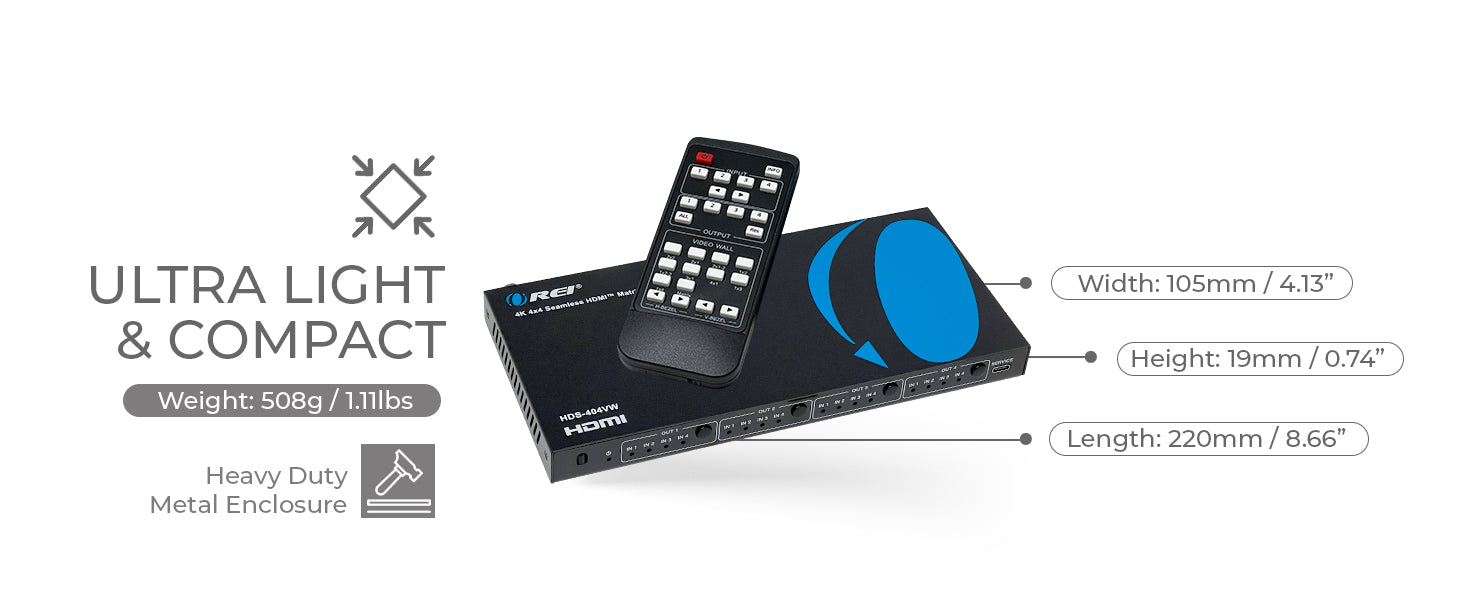 The HDS-404VW is a 4x4 HDMI Matrix and Video Wall Processor designed to deliver flexible multi-screen configurations in both Matrix and Video Wall modes. Fully compliant with HDMI 1.4 and HDCP 1.4 standards, it supports video output resolutions up to 4K@30Hz in Matrix mode and 1080p@60Hz in Video Wall mode, ensuring smooth and detailed visuals for various display setups.