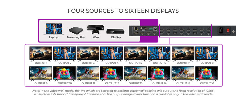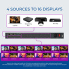 Scalable Matrix Design – Connects 4 HDMI input sources to 16 outputs, ideal for high-density AV environments.