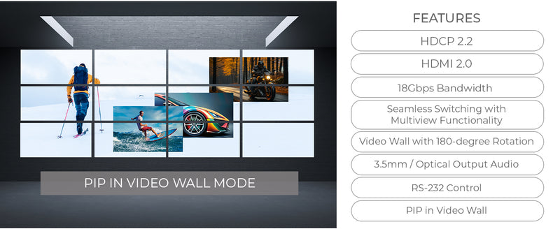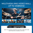 With seamless switching and integrated multiview window roaming, the UHD-416MVW allows users to display multiple sources on a single screen or across a video wall with complete control over layout and positioning. Video wall configurations support 180-degree image rotation for display flexibility. The unit also features 3.5mm and optical audio outputs for independent audio extraction.