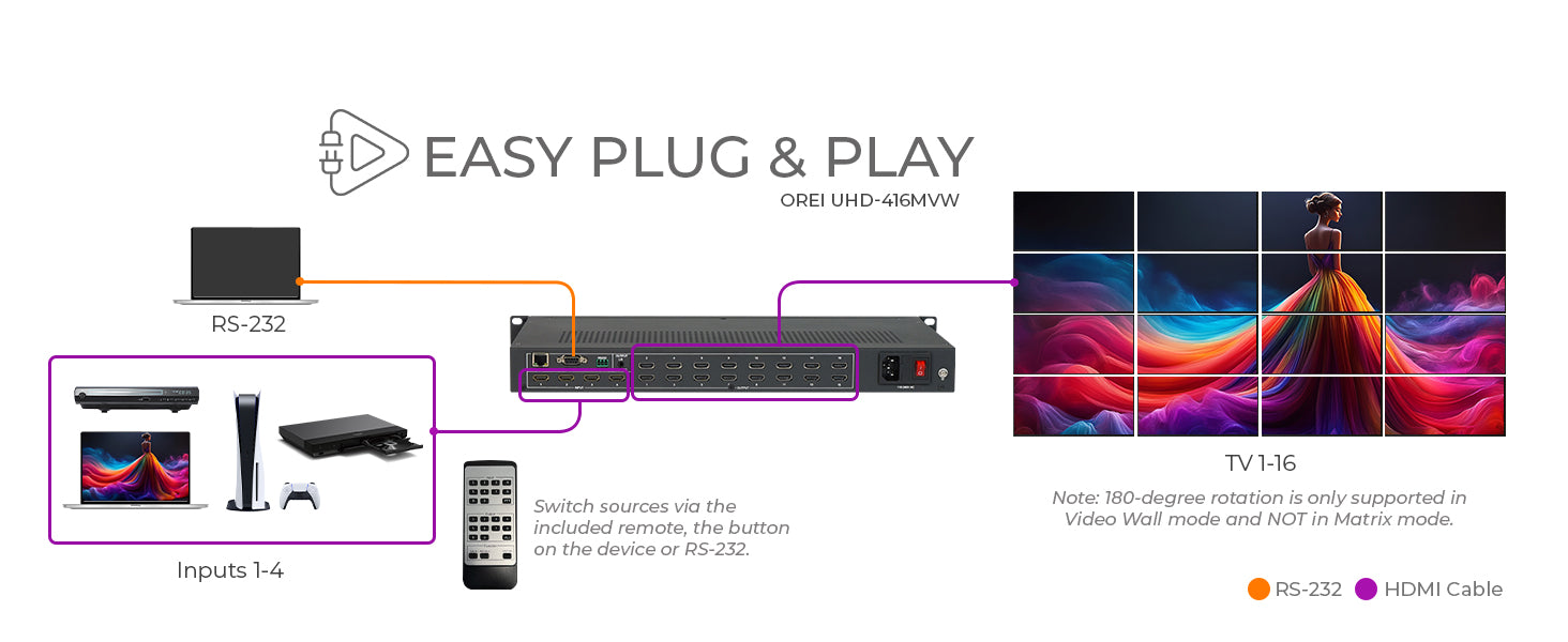 OREI UHD-416MVW: 4K@60hz 4x16 HDMI™ Matrix w/ Video Wall
