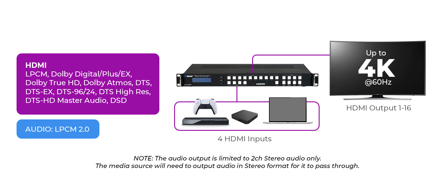 4K@60hz 4x16 HDMI™ Matrix w/ Video Wall (Seamless, Audio Extract, Multiview) (UHD-416MVW)