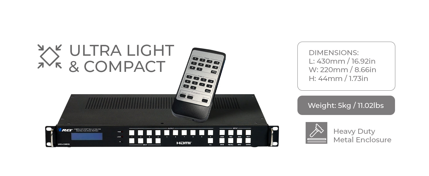 The UHD-416MVW is a high-performance 4×16 HDMI matrix switcher designed for professional AV environments that demand seamless switching, multiview capabilities, and large-scale video wall functionality. Fully compliant with HDMI 2.0 and HDCP 2.2 standards, it supports video resolutions up to 4K@60Hz with a full 18Gbps bandwidth, ensuring crystal-clear, uncompressed video across all outputs.