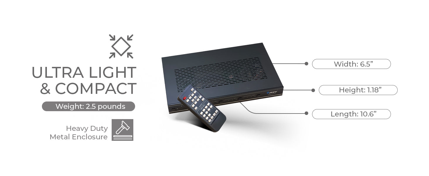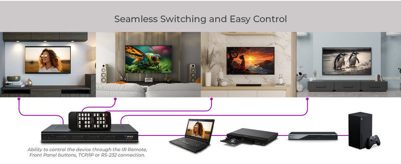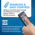Multiple Control Options – Operate using front panel buttons, IR remote, RS-232 commands, or TCP/IP network control.