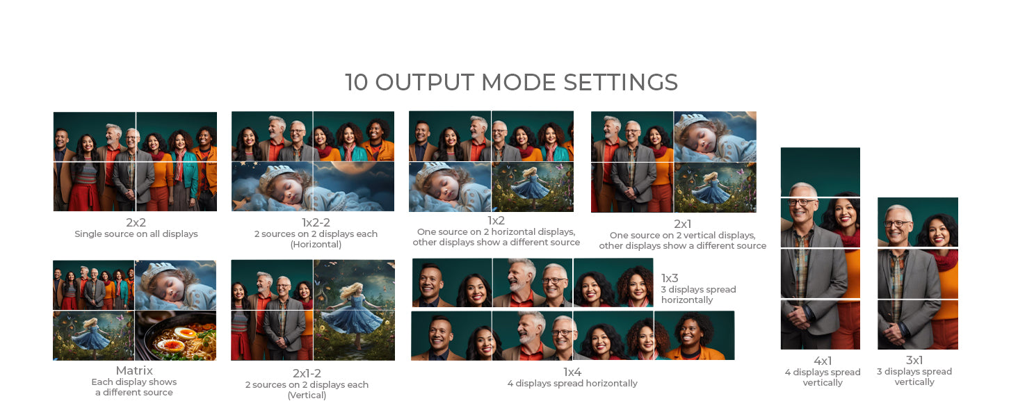 This unit offers advanced video processing capabilities, including seamless switching, resolution scaling, and configurable output modes such as 2×2, 4×1, and 1×4 video wall layouts.