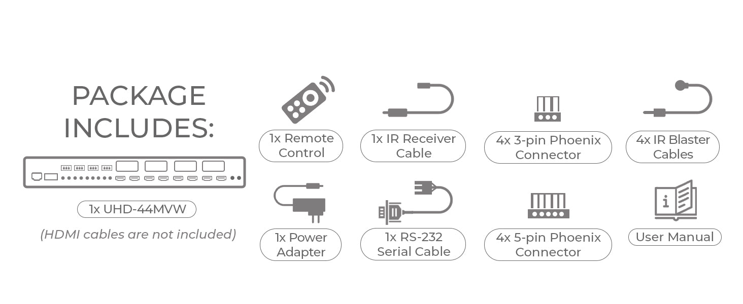 The UHD-44MVW 4x4 HDMI Matrix Switcher is a feature-rich AV solution designed to handle 4 HDMI inputs and 4 HDMI outputs with support for ultra HD 4K@60Hz 4:4:4 video. This all-in-one unit offers advanced Multiview and Video Wall functionality, allowing users to display multiple sources simultaneously or split one source across several displays.