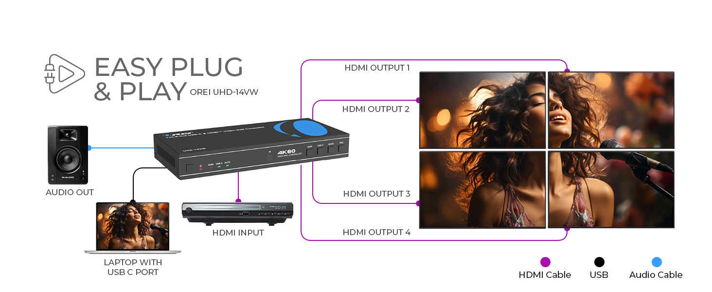 This video wall processor supports both HDMI and USB-C inputs, making it compatible with a wide range of modern media sources, including laptops, streaming devices, and Blu-ray players. The UHD-14VW also offers audio extraction via Optical and 3.5mm stereo outputs, providing you with flexible options for routing sound to external audio systems. Whether you're using it for an HDMI video wall or a more complex 4K video wall, this controller ensures that both video and audio are handled with precision.