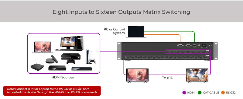 - 8x16 Matrix Switching – Distribute any of 8 HDMI™ sources to any or all of the 16 HDMI™ displays.