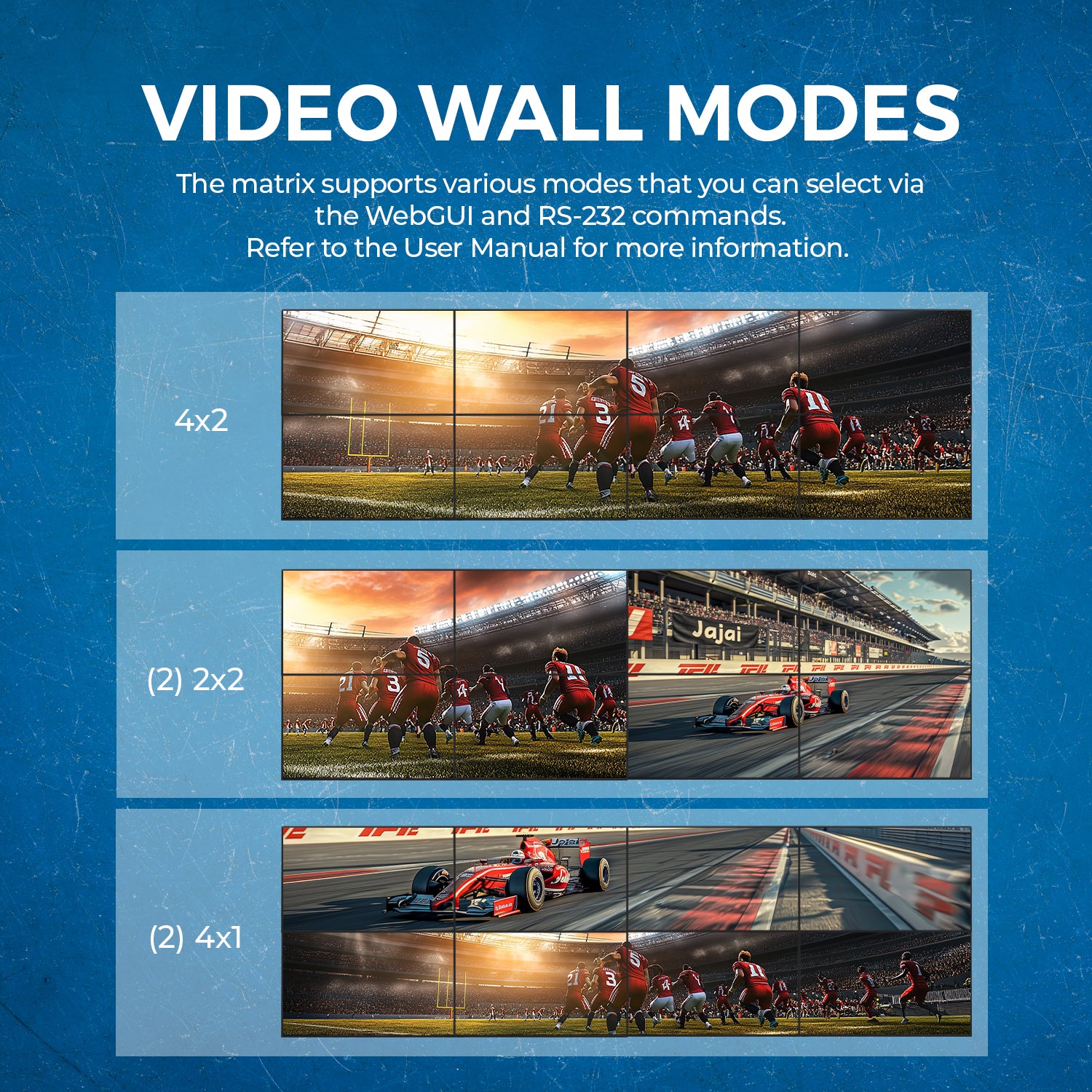 Video Wall Control – Enables multiple configurations including 4x2, 2x2, 8x1 and more.